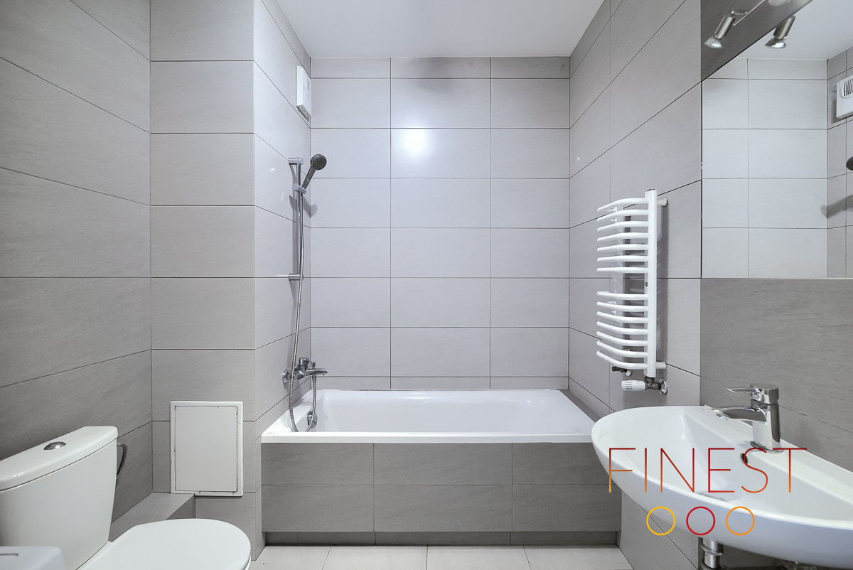 Łazienka: wanna, umywalka, lustro, kompakt WC, pralka.