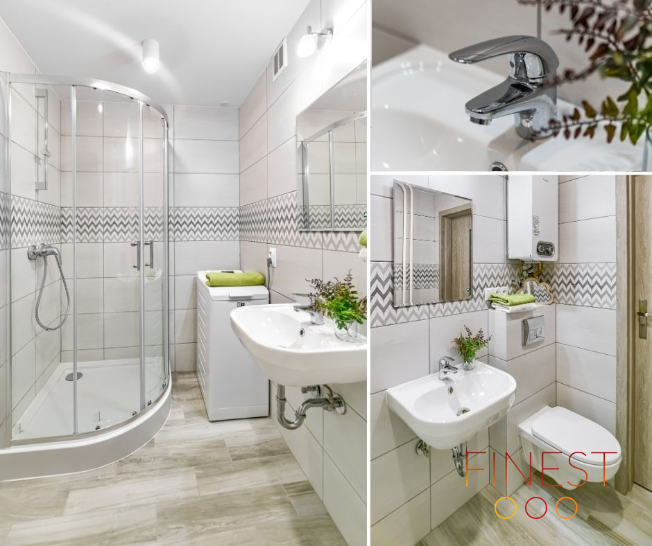 Łazienka: kabina prysznicowa, pralka, umywalka, lustro, zabudowany kompakt WC, piecyk gazowy Junkers.